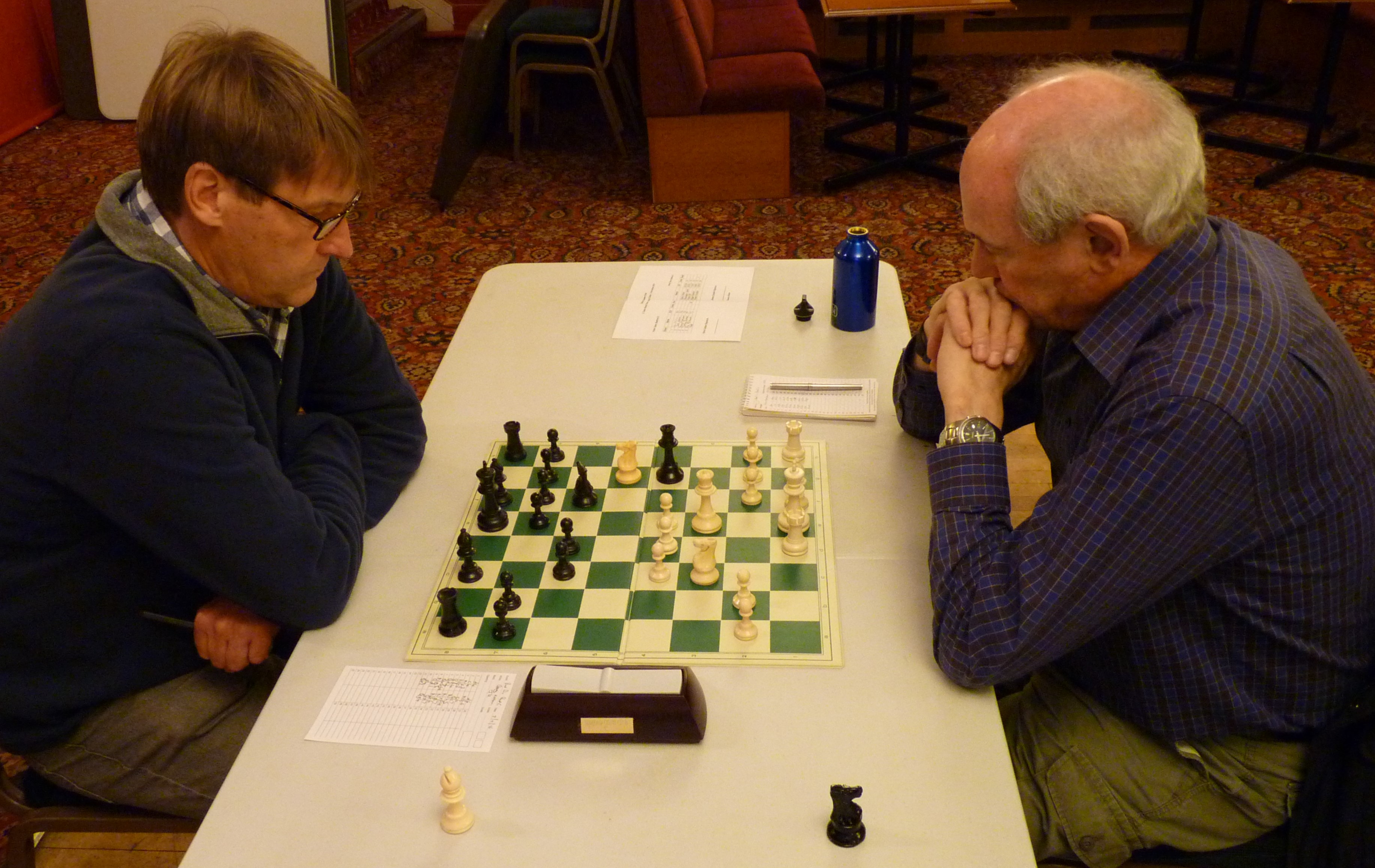Peter G had a good game and ended it with a textbook mating attack, following a Bishop takes Rook Pawn sacrifice, which evened the match score.
